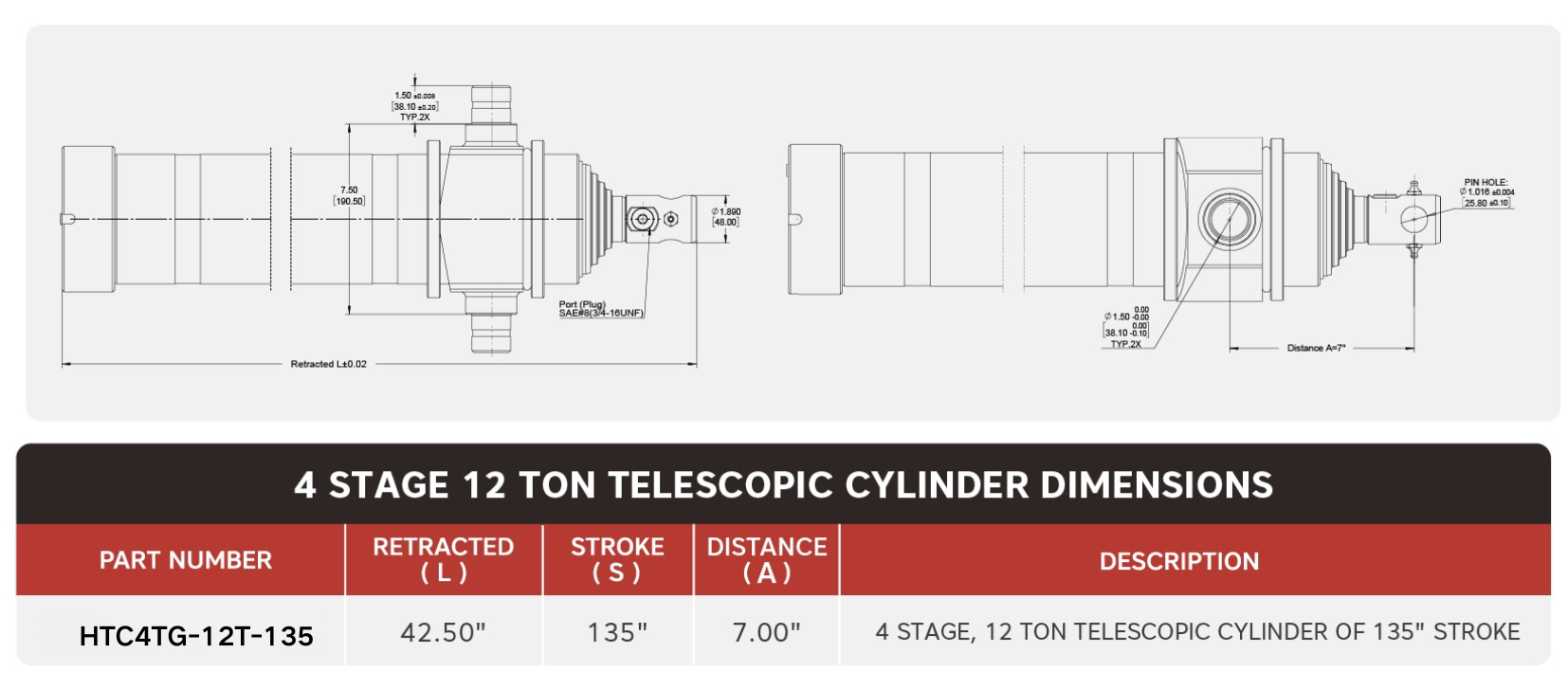 "HTC4TG-12T-135", 4-vaiheinen, 12 tonnia 135" iskun teleskooppisylinteri