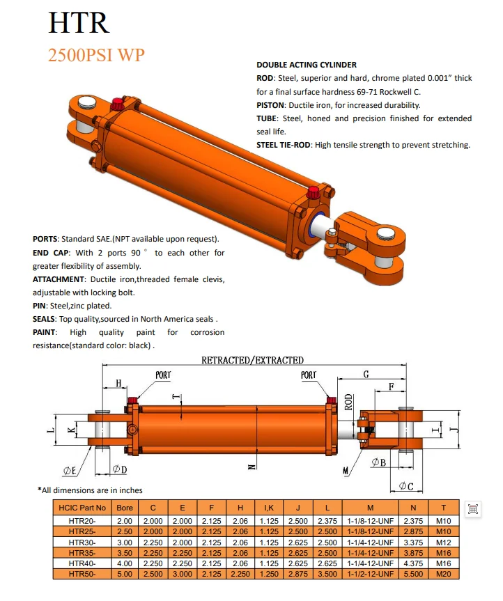 Tässä HCIC Standard Clevis -hitsatussa sylinterissä on 4" reikä, 36" isku ja 2" halkaisijaltaan 2" tanko. Kaksitoiminen SAE 8 (-08) ORB(F) työportit 2500 PSI maksimi käyttöpaine Clevis kiinnikkeet Mukana 1" asennustapit Kiiltävä musta maali on kestävä ja haalistumaton